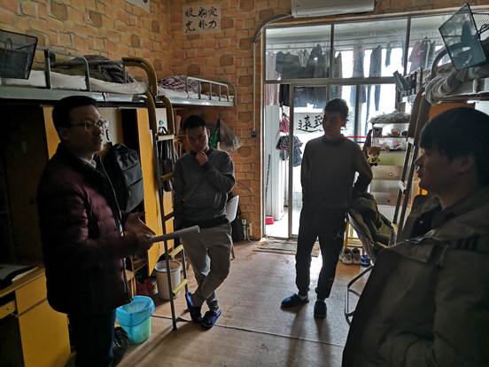 汽服1811班班主任刘祯博士和班级寝室导师张琎、程金铭、王敏旺、李燕等老师走访了汽服1811班所有寝室。刘祯说:“通过寝室走访,我发现与员工在寝室中谈话,与在办公室或教室不同,员工更放松,员工对老师的感觉不再是高高在上,访谈效果更理想。”
